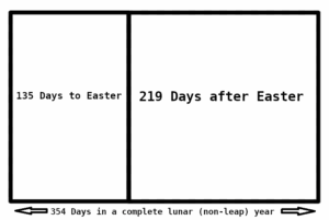The idea of counting days backward before Easter has already been discussed (here) but exactly how far forward and back one should go is not immediately obvious. It might seem that going back only as Septuagesima or the first Sunday after Epiphany or some other arbitrary point might be preferable and our reconstructed lunar year could end with Kislev, rather than the alternative. However, the striking thing about this precise arrangement is that the days before and after Easter are arranged in the so-called golden ratio. 220/134 is within .02 of the “golden ratio” (~1.618).2 Recall that the ordinary lunar calendar of 354 days divides neatly into two halves, each comprised of 177 days. We’ve already seen that pivot points around Easter and Sukkot, and Good Friday and the Ember Friday in September exist, but Christianity takes the lunar year and causes it to undergo an asymmetric fission, as it were, with the point of cleavage being the Feast of Feasts, the Resurrection.3